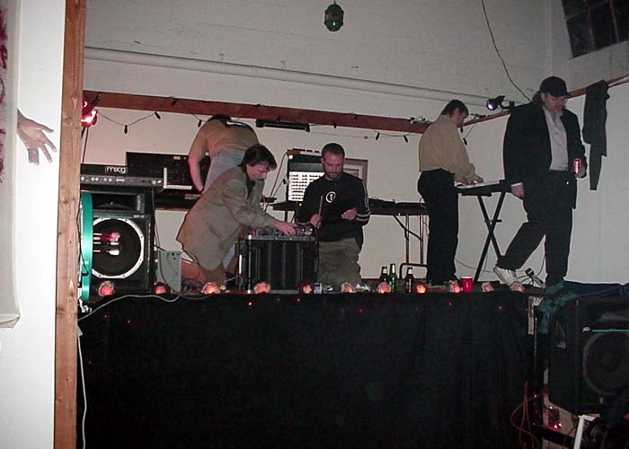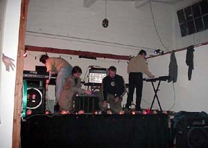 Cary Roberts (Retrosynth) sets up the Korg SQ10 sequencer while Jurg (Technosaurus) and Matt Wilson (Odyssey Sound) modulate VCOs with drum pads. John Van Nest (Jomox) tries to keep the sanity with the Sunsyn while ?? exits stage left.